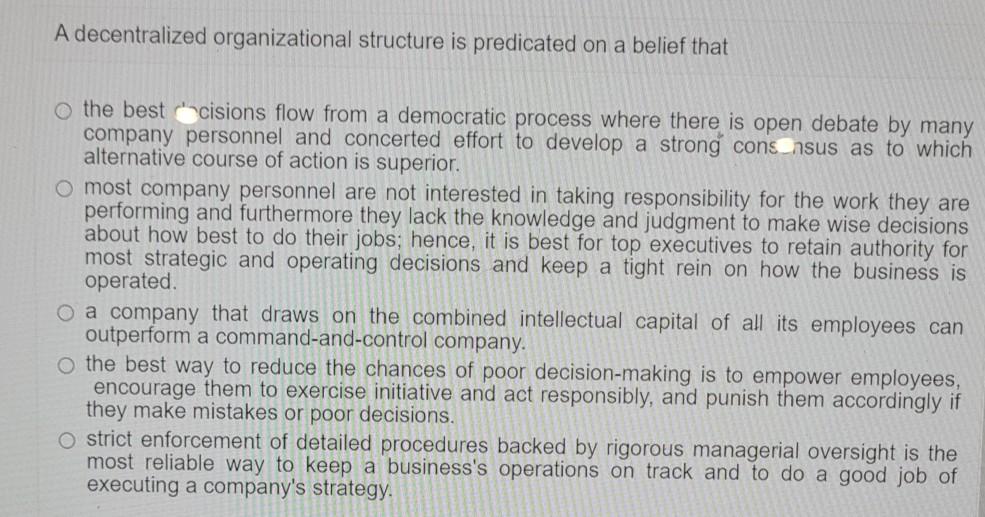 Solved A Decentralized Organizational Structure Is Chegg Com